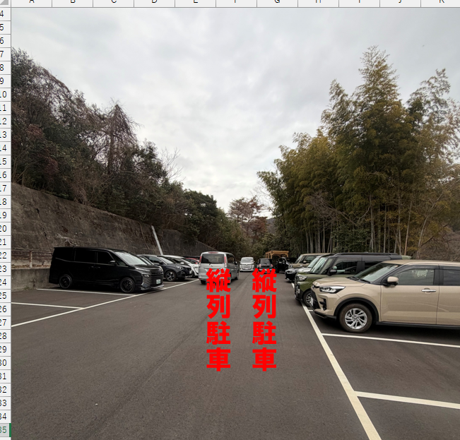 18時までの方(昼からの方も含め)は、写真の奥から縦列にて駐車してください。